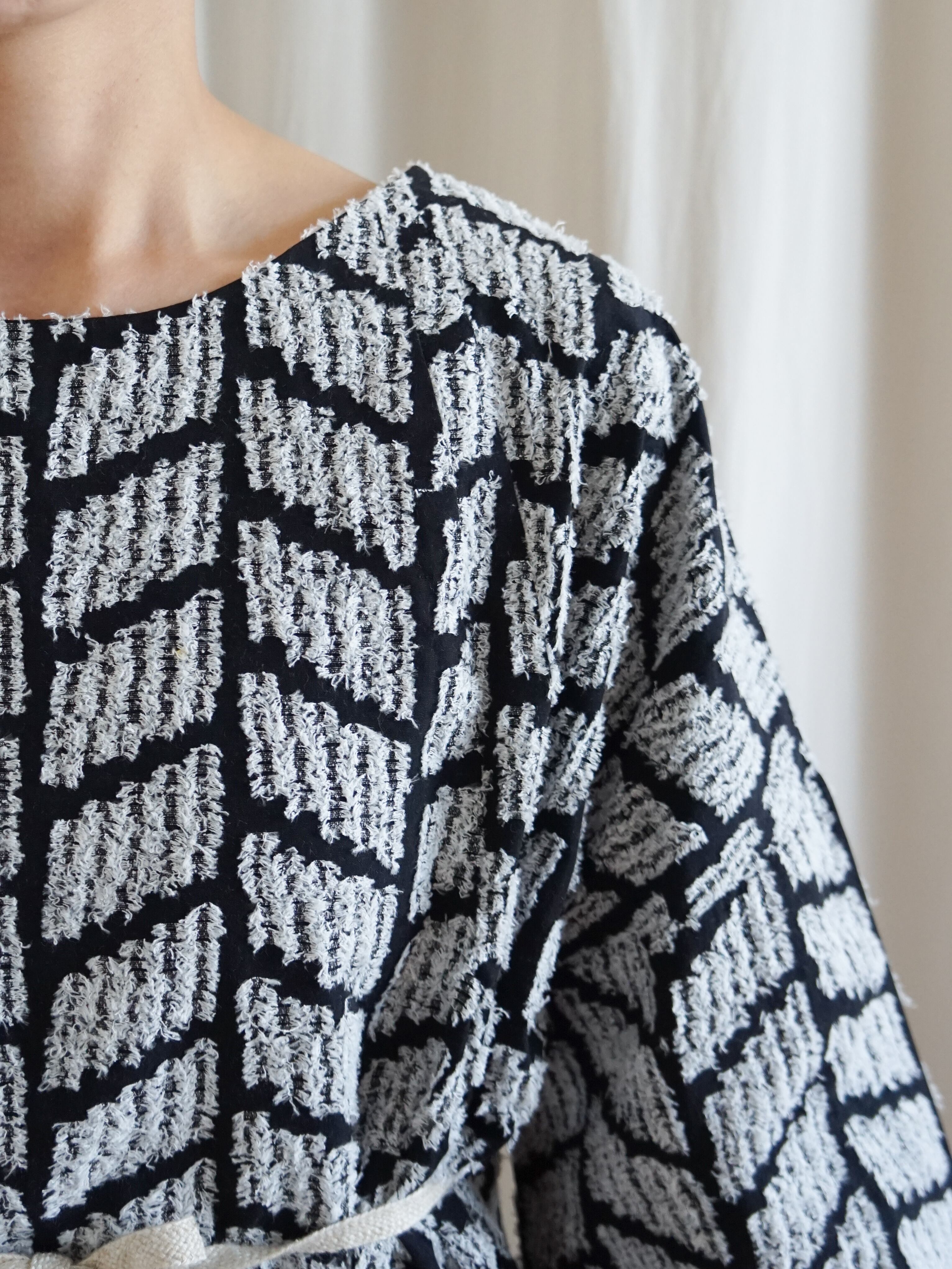 袖と裾がフレアシルエットになっており、ウエストの紐でブラウジングするとシルエットの変化が楽しめます。